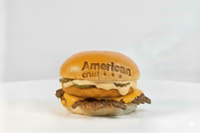 chifla, cascaval pane, castraveti murati, ceapa prajita, sos burger, sos american - 290g