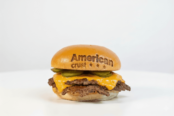 chifla, carne de vita Black Angus, cheddar, castraveti murati, ceapa prajita, sos burger, sos american - 300g